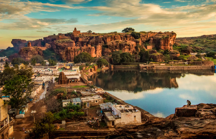 It is carved over – red-sandstone cliff and portrays the Badami Chalukyan architecture with some rock-cut sculptures dating back to the sixth and seventh centuries. In mythological times, this famous landscape was called Vatapi due to the Fort Vatapi that was built by the then Chalukyan Empire King, Pulikeshi.